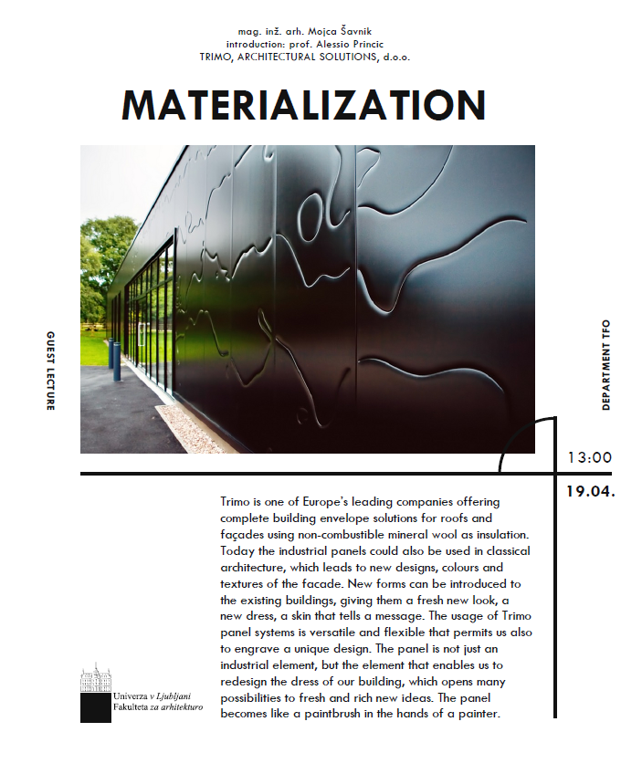 Yesterday our colleague Mojca Šavnik held a hosting online lecture at the Faculty of Architecture Ljubljana The lecture gave the students an inspiring view of how the Trimo metal building skin can blend into urban or rural architectural spaces and open the new, fresh and versatile possibilities of building design.